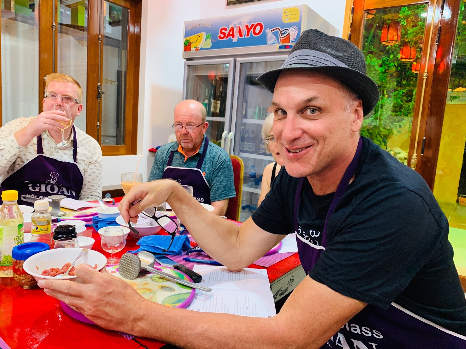 In the evening, our group participated in a Gioan cooking class. I enjoyed it a lot. The food was super fresh. We made: 1) Phò (Vietnamese Noodle Soup, 2) Fresh Spring Rolls, 3) Country Pancake (Bánh Xéo), and 4) Chicken Chili Lemongrass.